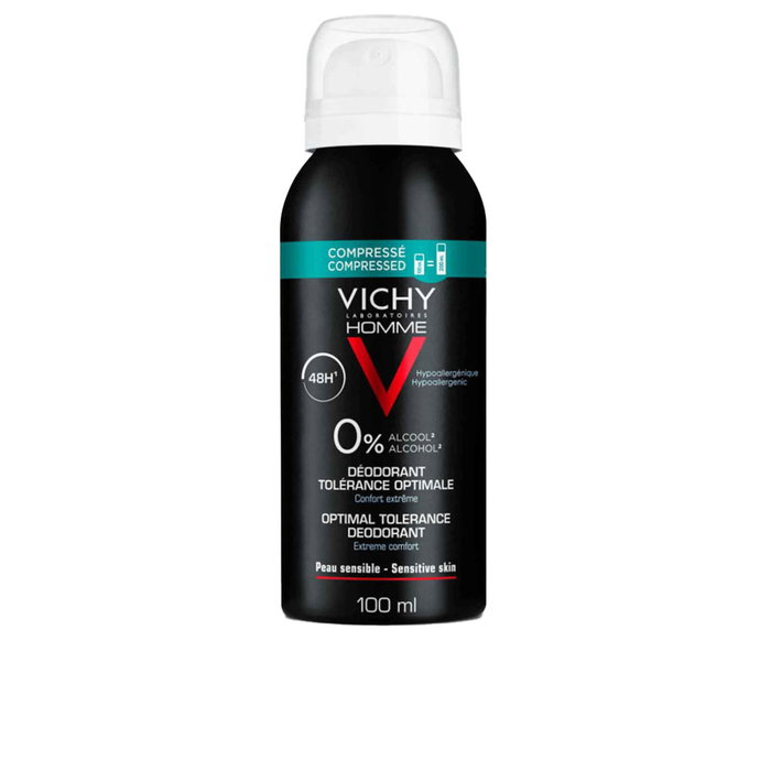 Desodorante HOMME tolérance optimale sensitive deo vaporizador de Vichy Laboratoires. El primer desodorante 48H para hombre en spray de Vichy. Es hipoalergénico y contiene 0% de alcohol. El envase es reciclable ecocomprimido.