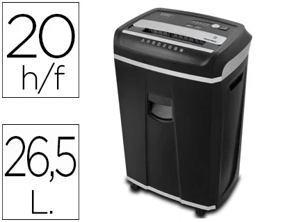Destructora ideal para uso profesional. Capacidad de corte: 20 hojas. Corte en partículas de 4 x 40 mm. Nivel de seguridad P-4. Ciclo de trabajo: 60 minutos. Sistema antiatascos. Tapa y sensor de seguridad. Reduce el consumo de energía. Reinicio automático. Destruye clips, grapas, CD y tarjetas de crédito. Con ruedas para un fácil desplazamiento. Papelera de 26,5 litros con ventana. Medidas: 414 x 666 x 302 mm. Peso: 16,6 kg.