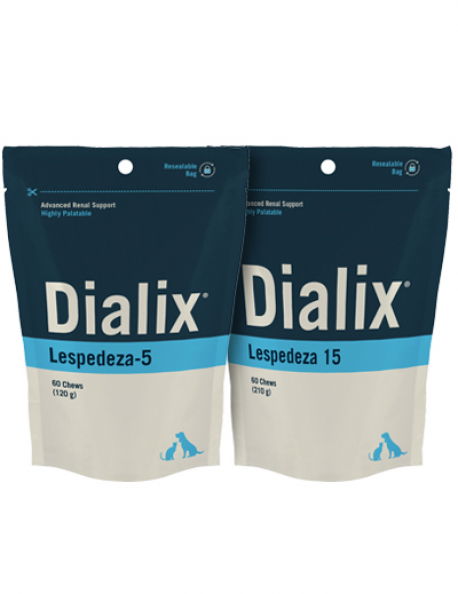 - Dialix® Lespedeza-5: Envase de 60 soft chews. Indicado para gatos o perros de tamaño pequeño (suficiente para 30 días de tratamiento).