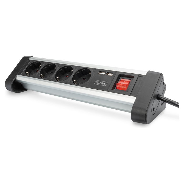 Digitus Regleta de alimentación de oficina de 4 tomas con 2 puertos USB, 1,5 m, Interior, Tipo E / F, Type F (CEE 7/4), Negro, Plata, Aluminio