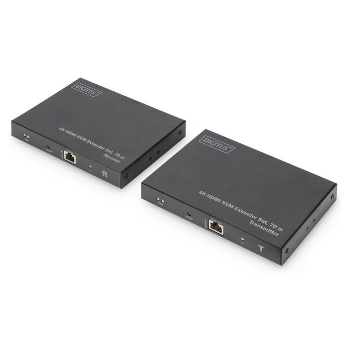 Digitus Juego de extensores KVM HDMI 4K, 70 m, Transmisor y receptor, 70 m, Cat6, Cat7, Cat8, Negro, Aluminio, Estado