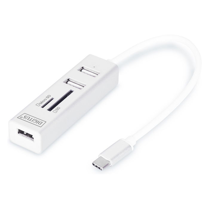 Digitus Concentrador OTG USB Type-C™ OTG con 3 puertos + lector de tarjetas, MicroSD (TransFlash), SD, Blanco, 480 Mbit/s, Aluminio, USB 2.0, 18 mm