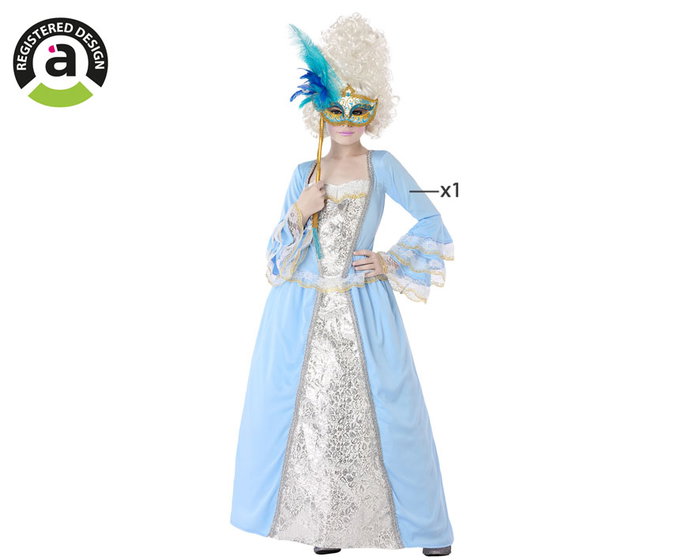 Disfraz infantil de cortesana de color azul claro ideal para una fiesta temática o actuación escolar. el traje se compone de: un vestido largo de tejido con pasamanerías en el pecho y mangas bordadas con detalles dorados y volúmenes. no incluye: peluca ni máscara.