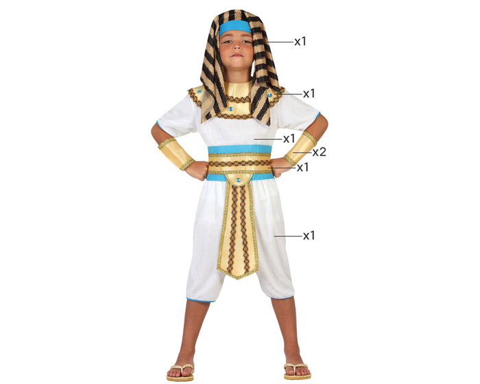¡viva el faraón! ¿buscas un traje de faraón para una representación escolar? ¿necesitas un disfraz del antiguo egipto para un belén viviente? ¿hay una fiesta de disfraces y te encantaría ser tutankamón? descubre el disfraz de egipcio para niños y déjales a todos con la boca abierta y sin palabras ya que con este disfraz de faraón para niños caerán rendido a tus pies. el disfraz se compone de una cofia en negro y dorado, un cuello en dorado, una camiseta blanca manga corta, dos brazaletes dorados, un cinturón en dorado y un pantalón corto blanco. esta es nuestra propuesta para un disfraz de la historia antigua con inspiraciones bíblicas.