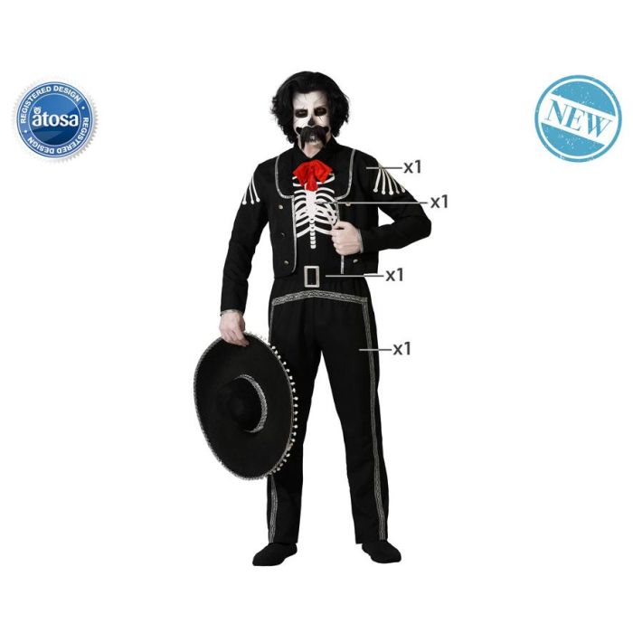 Disfraz de Calavera Negro para Hombre Adulto XS-S, Halloween, Día de Muertos. Incluye Chaqueta, Pantalón, Camisa y Cinturón.