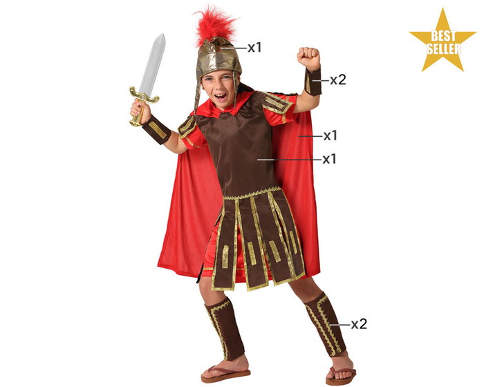 ¡ave cesar! este disfraz para niños es un completo uniforme de legionario romano de talla infantil perfecto para un gran disfraz de carnaval, una representación para navidad o fiestas como la de carthagineses y romanos. nuestro traje tiene el aspecto de haber sido confeccionado en la antigua roma para gloria de los ejércitos del césar así que no te compliques con un disfraz romano casero y quédate con un uniforme auténticamente romano. este genial conjunto se compone de una capa roja, una túnica marrón, un casco, dos muñequeras y dos espinilleras. ten en cuenta que la espada y las sandalias no están incluidas, aunque podrás encontrarlas en nuestra tienda de accesorios.