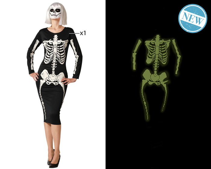 Elegante y llamativo, este vestido de esqueleto para mujer incorpora un diseño anatómico que brilla en la oscuridad. ideal para eventos nocturnos, fiestas de disfraces o halloween. su corte femenino y su efecto luminiscente harán que no pases desapercibida.