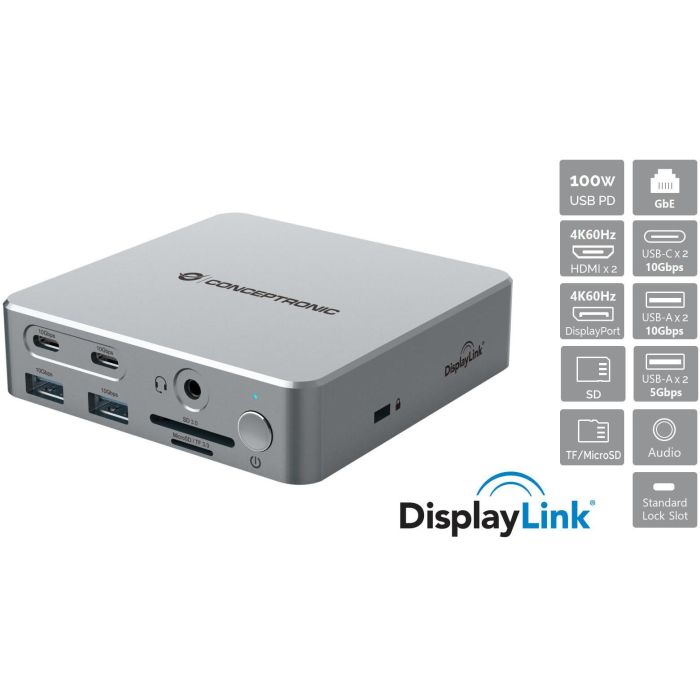 Conceptronic DONN25G Docking Station 15 En 1 Plata USB 3.2 Gen 2 Type-C HDMI Ethernet