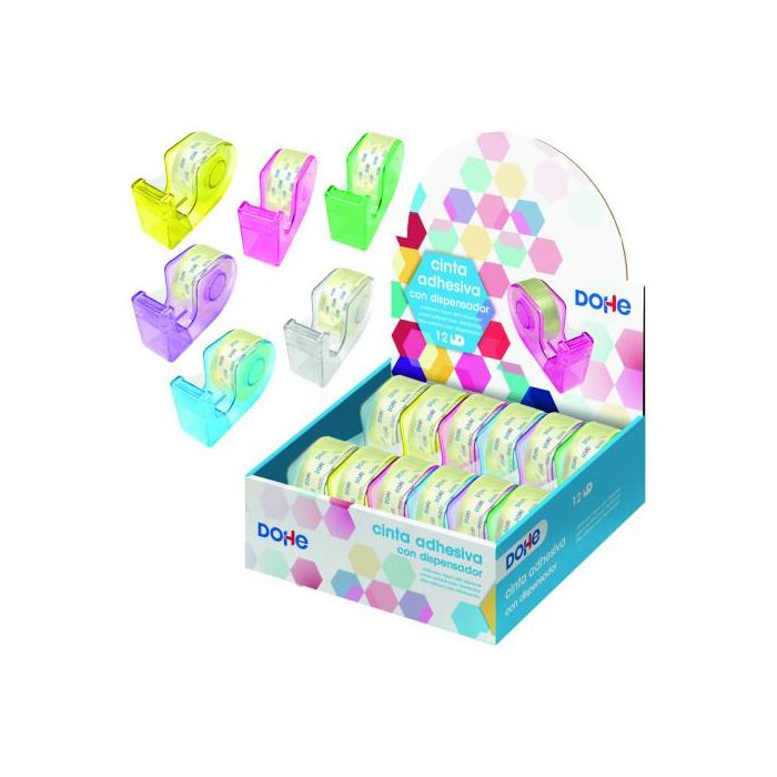 Dohe Expositor 50987 con 12 Dispensadores de Cinta Adhesiva Colores Surtidos (Amarillo, Morado, Azul, Verde, Rosa y Transparente) 18mm x 20m