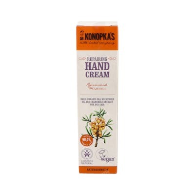 Indicaciones: Esta crema de manos reparadora natural y certificada está basada en la receta del Dr. Konopka’s para el cuidado de pieles secas. Contiene espino amarillo orgánico para nutrir la piel e hidratarla y facilitar la regeneración de la piel. El extracto de manzanilla calma y suaviza la piel. Producto vegano. Cosmos Natural.