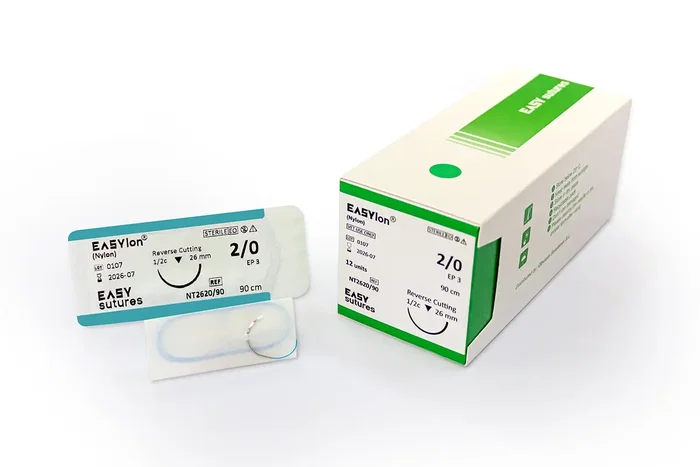 Easylon Sutura No Absorbible Monofilamento 24 mm, calibre 2-0, con aguja Triang 3-8C de 90 cm. Marca: Obvium.