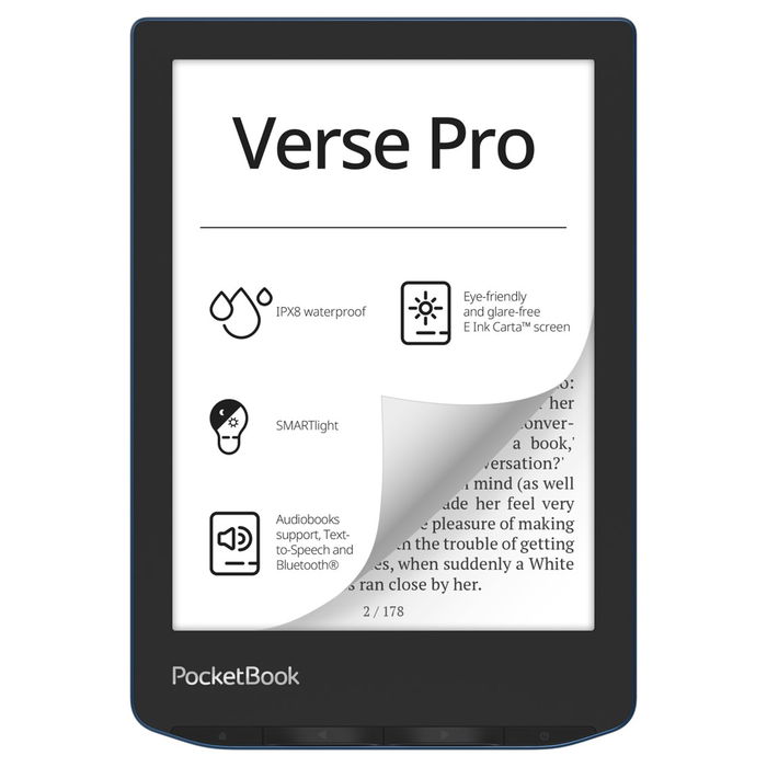 PocketBook Verse Pro cuenta con caracter�sticas tan avanzadas como soporte para audiolibros y Text-to-Speech con Bluetooth, SMARTlight ajustable y protecci�n IPX8 contra el agua.