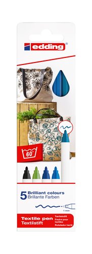 Rotulador textil de punta redonda con trazo de 1 mm y tinta pigmentada a base de agua, de olor neutro, de secado rápido y extremadamente resistente a la acción de la luz, Para decorar y dibujar sobre la mayoría de textiles claros, como el algodón, la seda y el lino. Resistente al lavado hasta 60 °C tras fijar la tinta planchando la prenda (sin vapor). Crea fantásticos regalos o personaliza tus prendas de ropa. Caja con 5 colores surtidos: negro, rojo, azul, verde y amarillo.