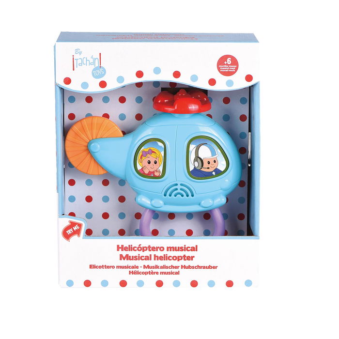 Un juguete musical para los bebés, que estimula sus sentidos y forma parte de sus primeros aprendizajes mediante la asociación y la coordinación mano y ojo. Incluye sonidos y música, un asa para facilitar el agarre del juguete a los más pequeños y una ruleta como aspas del helicóptero para mejorar la motricidad fina. Funciona con 2 pilas de tipo AAA que vienen incluidas. Recomendado para niños desde los 6 meses.