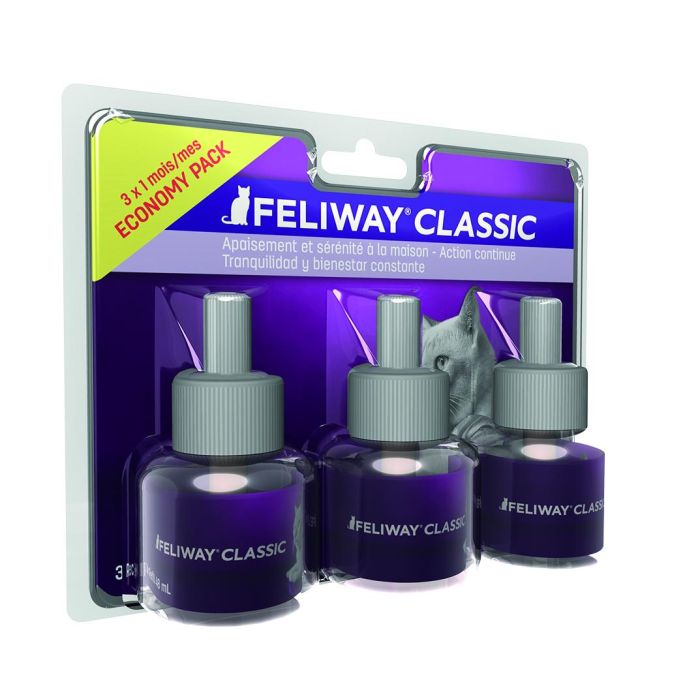 - Observaciones: FELIWAY es una solución excelente para que los gatos se sientan cómodos en casa y prevenir comportamientos como el marcaje con orina, que arañen los muebles o se escondan. Mejora la relación con tu gato, creando un entorno agradable en el hogar. Efecto continuo, proporciona comfort y seguridad constantes para tu gato. Probado científicamente, utilizado y recomendado por veterinarios. Cada difusor cubre un área hasta 70 m2 Evita enchufar el difusor debajo de estanterías, detrás de puertas, cortinas o muebles, porque no funcionará correctamente. Asegúrate de proporcionarle un apoyo continuo a tu gato usando un FELIWAY CLASSIC Recambio cada mes. El difusor debe ser revisado mensualmente y renovado cada 6 meses para asegurar un efecto óptimo.