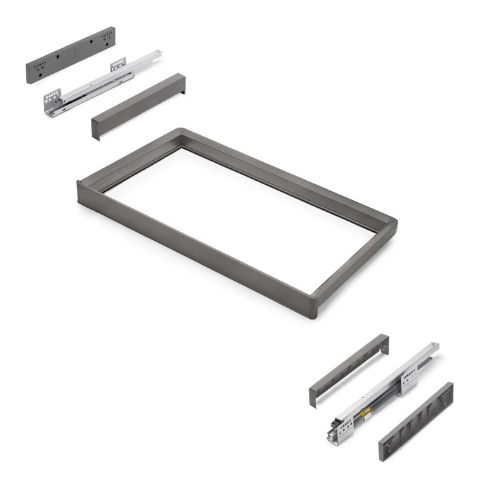 El kit incluye todo lo necesario para una instalación rápida y ordenada, como 1 bastidor, 1 juego de guías, 1 juego de distanciadores, 1 juego de tapas embellecedoras, 8 tornillos (Ø3.5x30 mm) y 4 tornillos (Ø4.5x20 mm), todo cuidadosamente empaquetado.