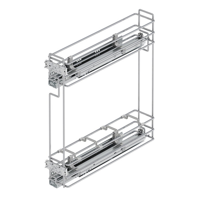 Botellero extraible para módulos inferiores de cocina fabricado en acero cromado ideal para espacios reducidos o muebles auxiliares. Fácil instalación: fijación en el lateral izquierdo del mueble y regulación total de la puerta. La estructura está fabricada en acero cromado con 2 niveles e incorpora guías de rodillos con extracción total y cierre suave que permiten un suave deslizamiento del sistema evitando los portazos. El cesto inferior dispone de 4 huecos para la organización de las botellas. Capacidad de carga de hasta 30kg.