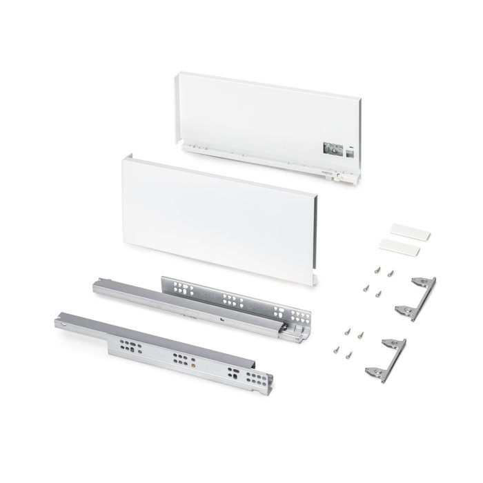 El cajón de cocina y baño Protone está disponible en formato kit con todos los herrajes necesarios para su montaje. Destaca además por su gran capacidad de carga que puede llegar a soportar hasta 30 kg por cajón. Incluye guías de extracción total con cierre suave, juego de enganches y costillas disponibles en acabado pintado blanco o gris antracita. Sólo necesitará los tableros cortados a las dimensiones correctas para el fondo, la parte trasera y la frontera del cajón.