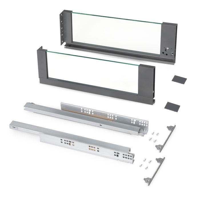 El cajón Vertex con laterales de vidrio se compone de todos los elementos necesarios para su montaje. Sólo necesitaras los tableros cortados a las dimensiones correctas para el fondo, la parte trasera y la frontera del cajón.