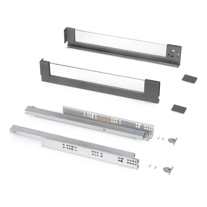 El cajón Vertex con laterales de vidrio se compone de todos los elementos necesarios para su montaje. Sólo necesitaras los tableros cortados a las dimensiones correctas para el fondo, la parte trasera y la frontera del cajón.