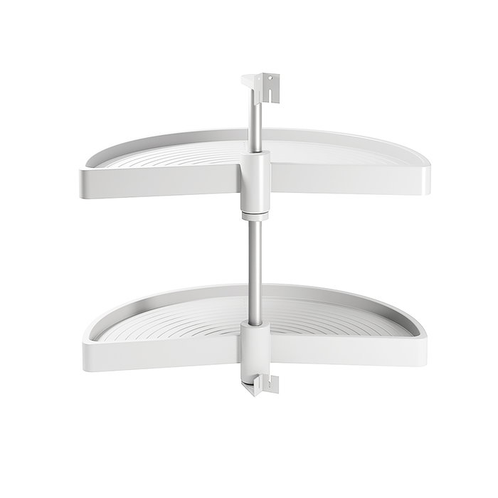 Bandejas giratorias media luna diseñadas para aprovechar el espacio en muebles rinconeros de cocina con forma de L. Son de fácil instalación y adaptables a diferentes alturas de módulos. Están disponibles para medidas de módulos de 800 mm y 900 mm y en acabados blanco y gris . El sistema está compuesto por 2 bandejas y accesorios de montaje fabricados de plástico reciclable, antiestático, de alta resistencia a impactos y a los rayos ultravioletas y por una barra central de aluminio en acabado anodizado mate. Tienen una capacidad de carga de 20kg por bandeja.