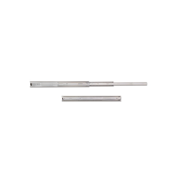 Guías de bolas con extracción total fabricadas en acero cincado. Guía de altura 45mm. Se fija al costado del mueble mediante tornillos (no incluidos) y disponen de un gatillo para su desmontaje. Carga máxima de hasta 30kg.