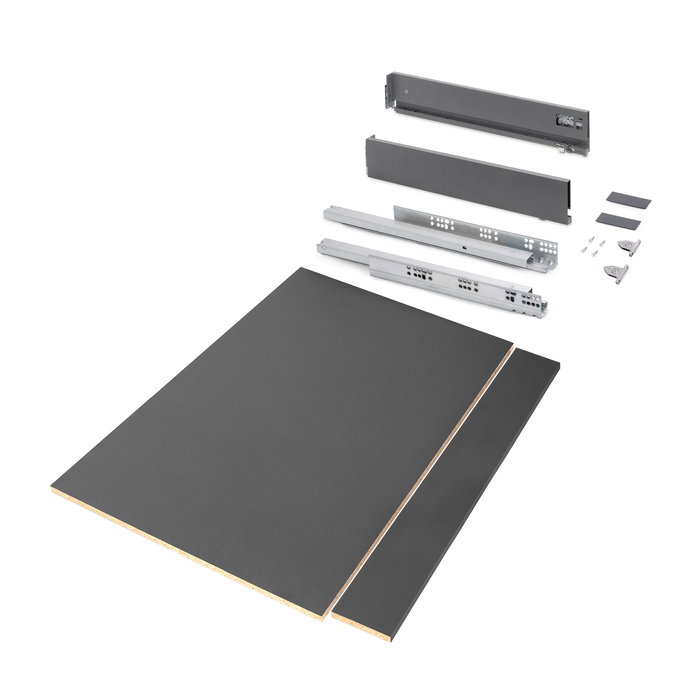 Kit para cajón para cocina y baño con todos los elementos necesarios para su montaje. Es la solución óptima para los muebles de tu cocina, baño o armario con un elegante diseño en color gris antracita y blanco. Cada kit se compone de todos los elementos necesarios para el montaje de un cajón exterior de altura 93mm y profundidad 500 mm con varias anchuras de módulo. Incluye: dos costillas laterales, un juego de guías con cierre suave, un juego de tapas embellecedoras, tableros para fondo y trasera y las fijaciones para el frente del cajón. Simplemente se necesitará el panel frontal con las dimensiones necesarias del cajón.