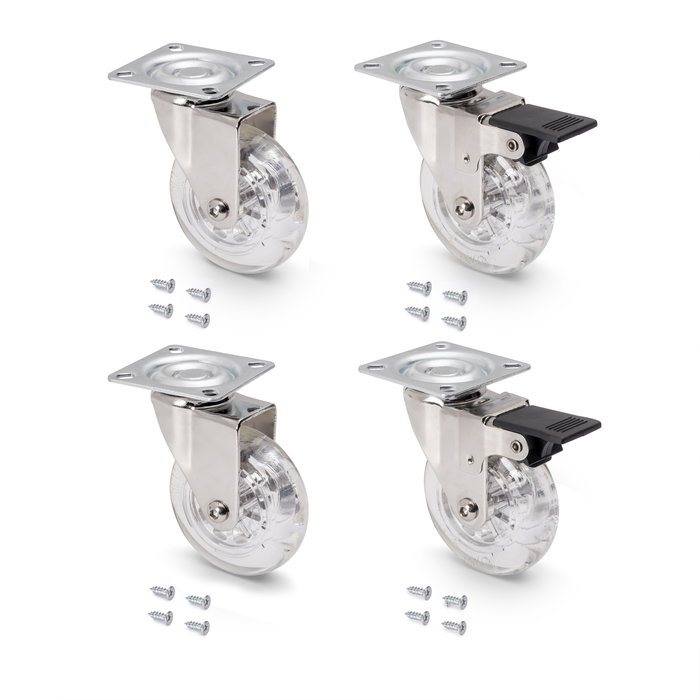 Cada kit está compuesto de 2 ruedas con freno, 2 ruedas sin freno y los tornillos necesarios para su montaje.