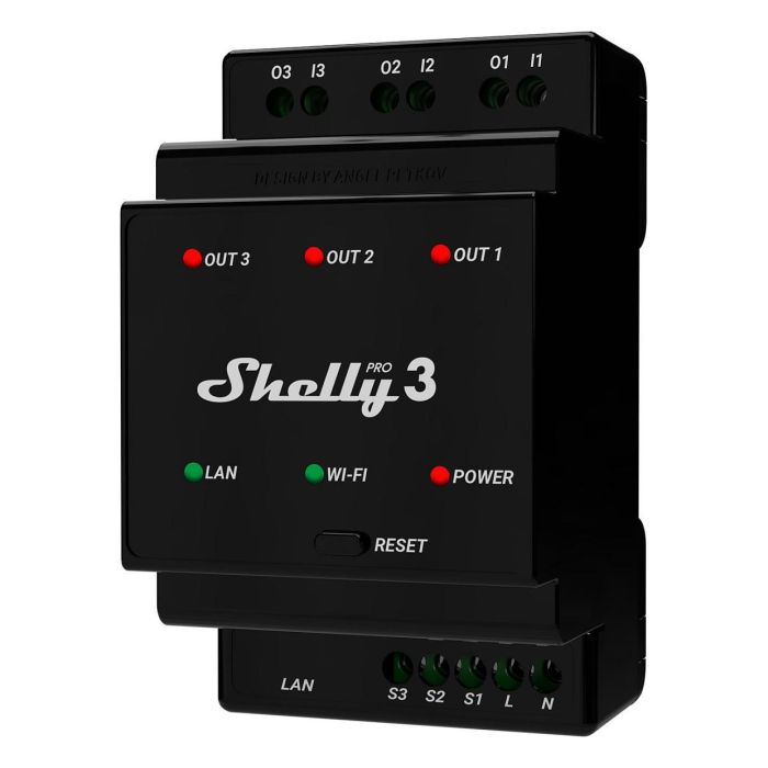 Shelly Pro 3, Relé inteligente, Negro, 802.11b, 802.11g, Wi-Fi 4 (802.11n), 2,4 GHz, 30 m, 13,35 dBmW