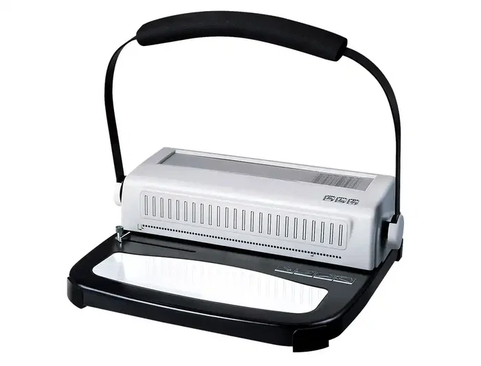 Encuadernadora manual de espiral de plástico o metálica. Perfora hasta 20 hojas de 80 g/m² con tamaño máximo de folio apaisado. Encuaderna hasta 450 hojas. Espiral de 50 mm. Paso de la espiral 5:1. Escala de perforaciones serigrafiada y tope lateral. Palanca en U con goma para facilitar la perforación. Medidas: 420 x 345 x 200 mm. Peso: 15 kg.