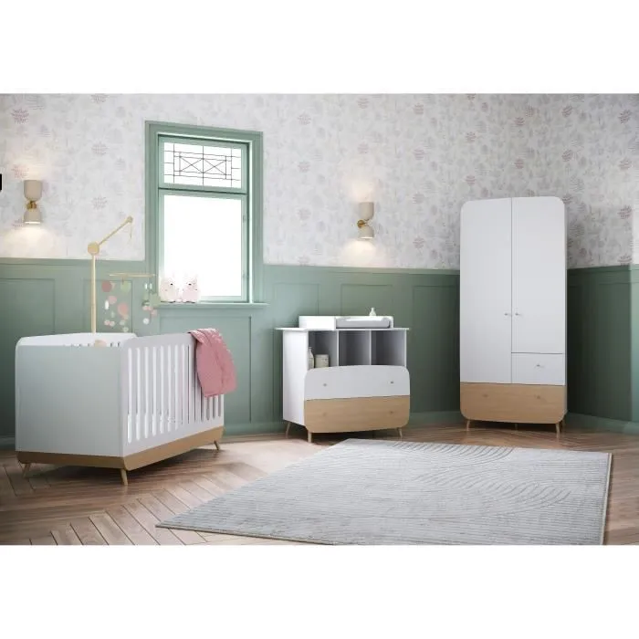 Ens. Cuna 70 x 140 Kit escalable, cómoda 2 cajones, 3 nichos y 1 cambiador, 1 armario - FIRMIANA - Blanco y madera - DEMEYERE
