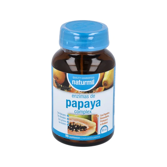 Composicion: Agente de carga: celulosa microcristalina, antiaglomerante: estearato de magnesio, Carica papaya (Papaya; enzima papaína), Ananas conosus (Piña; enzima bromelaína), Carica papaya (Papaia; extracto), antiaglomerante: dióxido de silicio, proteasa, a amilasa. Por 3 comprimidos: Papaína 75 mg, Bromelaína 60 mg, Extracto de Papaia 60 mg, Proteasa 6 mg, a Amilasa 6 mg.
