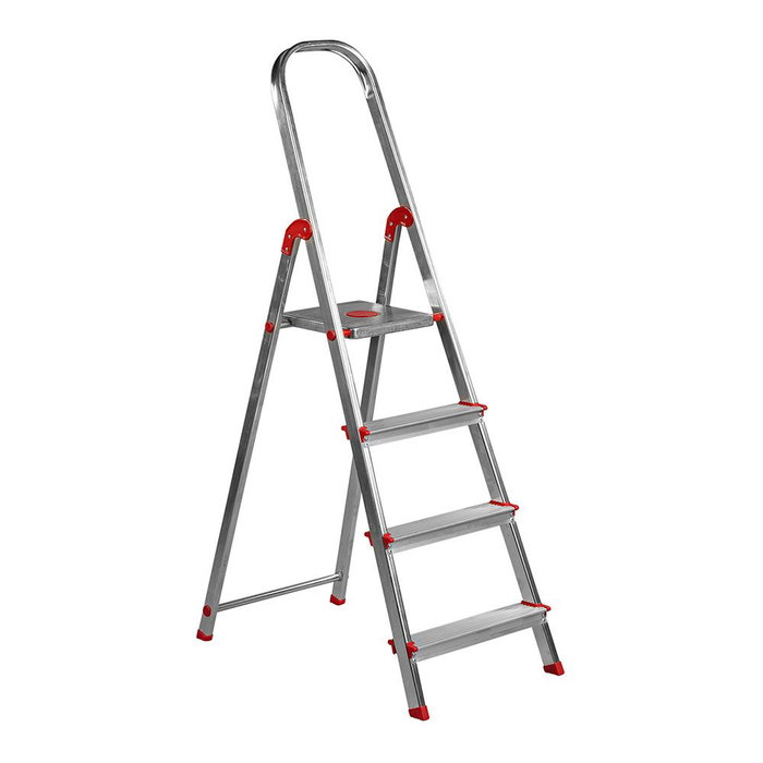 Escalera de 4 peldaños, de aluminio. arco de apoyo con altura de seguridad de 60 cm, peldaños antideslizantes y con sistemas de puntos fuertes. rellano con sistema de seguridad y amplia superficie de apoyo. resistencia de carga: 150 kg. altura máxima: 80 cm (hasta plataforma), altura alcanzable 2,80 m. escalera certificada por aenor según norma europea en-131. dimensiones: 43,8 x 11,5 x 151,2 cm