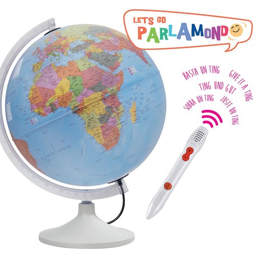 Esfera con luz de 30cm. Incluye un lapicero interactivo. Dispone de 8 menús temáticos. Con 6 idiomas disponibles. Con tan solo un ting podrás saber: nombre, capital, población, idioma, geografía física y política y hechos importantes e interesantes del país.