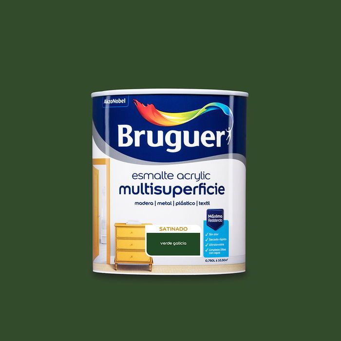 Esmalte acrylico multisuperficie satinado verde galicia 750 ml para interior y exterior con acabado lacado suave al tacto. sin olor y de rápido secado. sin disolventes