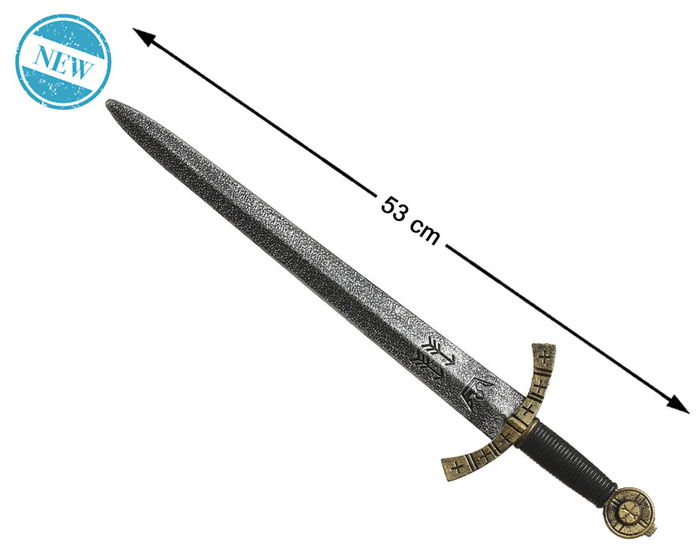 Transpórtate a la edad media con esta espada corta de 53 cm. su hoja plateada y empuñadura dorada con detalles rúnicos la hacen perfecta para representar a caballeros, cruzados o soldados de fantasía. ideal para ferias medievales, fiestas temáticas o halloween. añade autenticidad y fuerza a tu disfraz.