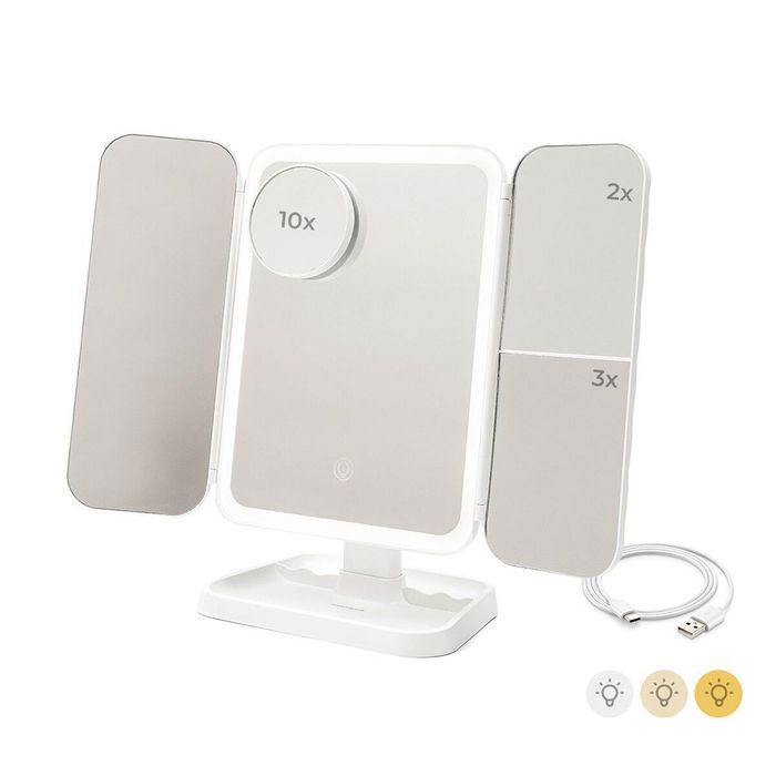 Espejo tríptico plegable de sobremesa con aumento y luz led recargable 5 v, 3 tonos de luz: 3000 - 4000 - 6500 k, flujo luminoso regulable: 31 - 33 - 44 lm, dispone de un botón táctil para regular la intensidad, áreas de aumento: 2x y 3x. incluye un pequeño espejo extraíble de aumento 10x, pies antideslizantes. multiposición, inclinación hasta 90° y rotación ajustable hasta 180°. se recarga mediante cable usb-c, incluido