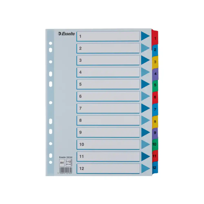 Esselte Separador Numérico 1-12 Cartulina Mylar Borra DIN A4 Multitaladro Multicolor Juego de 12