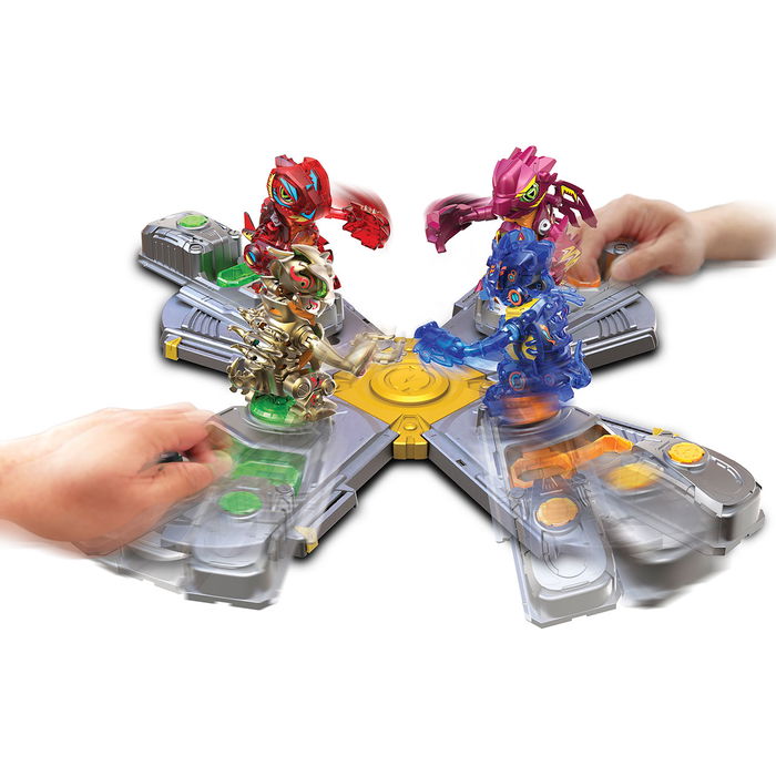 Presentamos el Estadio Arena, la arena de combate, ¡para una pelea de hasta 4 jugadores! Compatible con todas las criaturas Biosaurus Kombat. La arena puede sujetarse fi rmemente sobre una superfi cie plana con la ventosa suministrada. El marcador situado en el lateral de la base de cada estadio arena permite grabar hasta 5 rondas de combate. Construye tus propios luchadores electrónicos de 9cm con las piezas incluidas. Con efectos de luz y sonido. Fíjalos en las bases y ¡vamos a la pelea! Listos para golpear a izquierda, derecha y por sorpresa. ¡Apunta y golpea el corazón de tu enemigo para que pierda la cabeza y destruirlo!