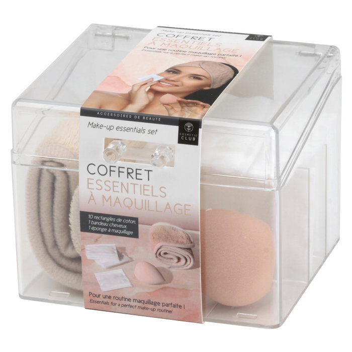 - Caja transparente con compartimentos que incluye: _ 10 rectángulos desmaquilladores de algodón.
