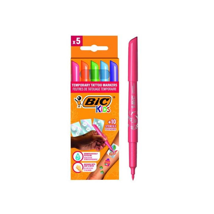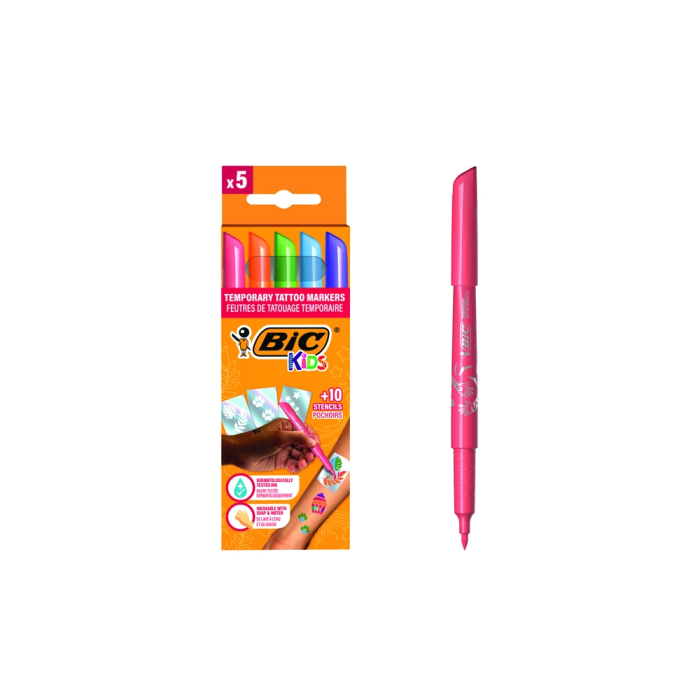 BIC Estuche 5 Rotuladores Especial Tatuaje Tinta Base Agua Punta Pincel + 10 Plantillas 516874