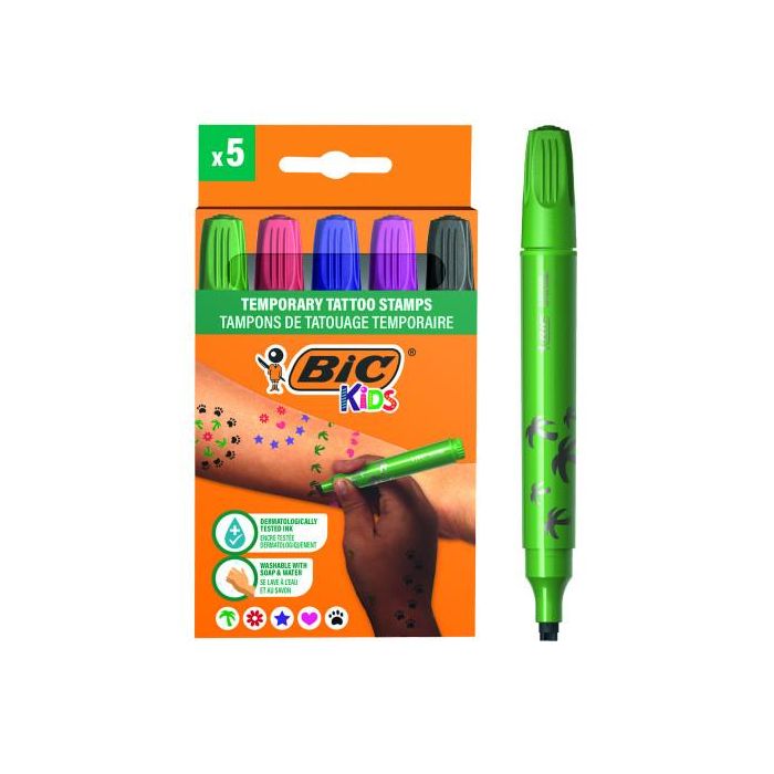 BIC Estuche Tattoo 5 Stamps Rotulador a base de agua con 5 sellos divertidos y tinta dermatológicamente probada 516824
