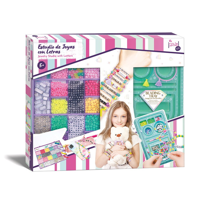 Estudio deluxe de joyas. Incluye más de 1300 piezas entre las que destacan, cuentas del abecedario para poder poner los nombres que quieras, perlas, borlas, pompones, etc