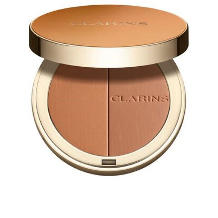 EVER BRONZE dúo de polvos bronceadores de Clarins. Consigue un brillo radiante y un tono dorado perfecto con estos polvos de sol. Su fórmula ultra fina y sensorial se desliza suavemente sobre la piel, ofreciendo un acabado fresco, sutil y natural ideal para técnicas de contouring y realce facial.