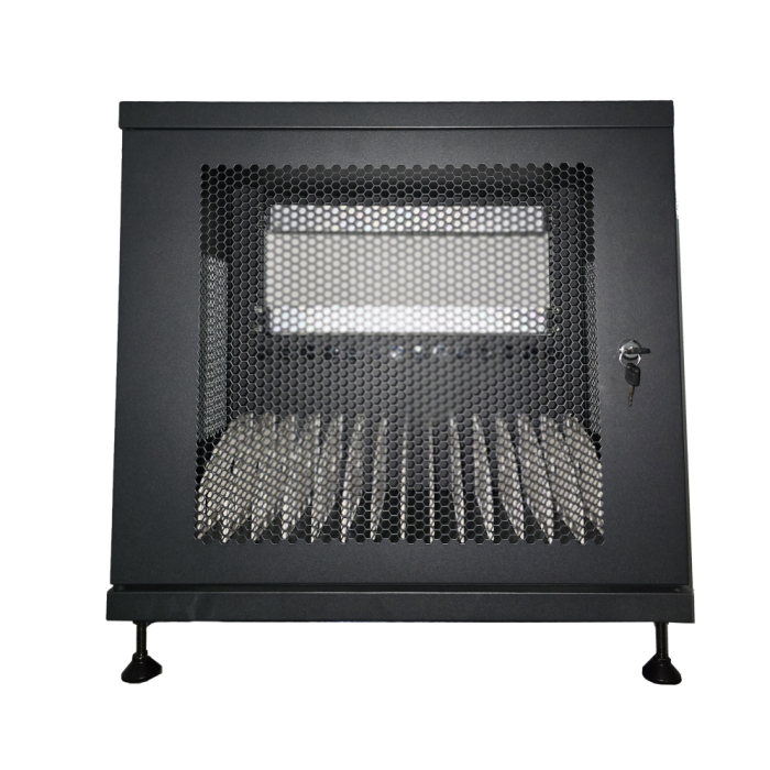 Para garantizar una ventilación óptima, la puerta frontal y el panel trasero están perforados. Además, la seguridad se mejora con una cerradura con llave. Los paneles laterales fijos cuentan con una sección perforada central para facilitar el intercambio de calor y los orificios para el paso de cables están equipados con pasacables de goma. En el interior, un estante con 14 divisores de metal y pasacables permite una gestión ordenada de los cables.