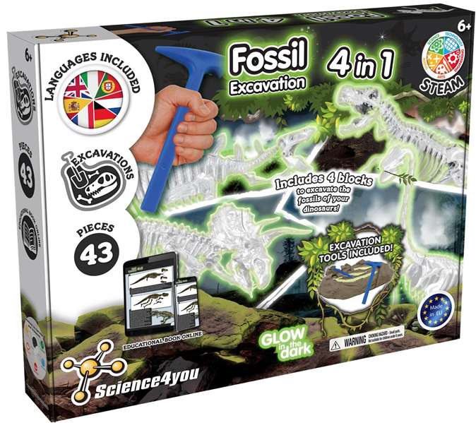 Science for You Juego de Excavaciones 4 en 1 Dinosaurios que Brilla en la Oscuridad, 30x30x6 cm