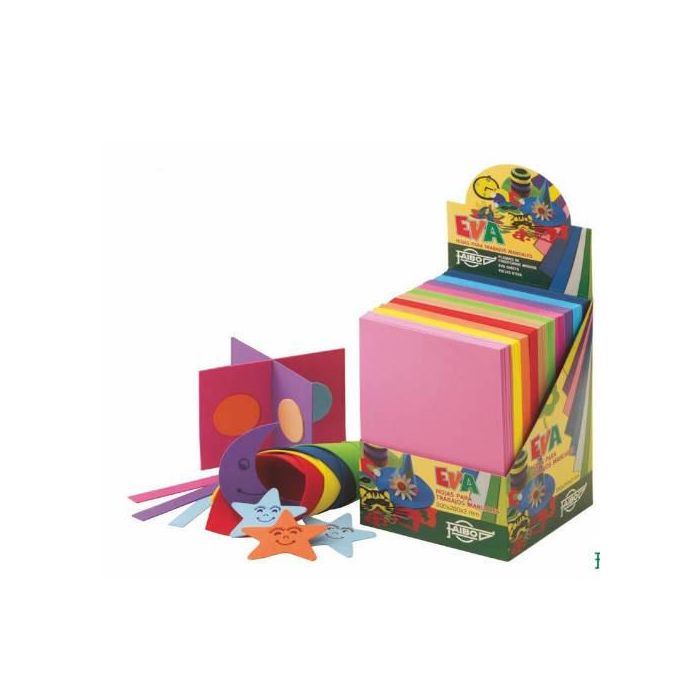 Expositor conteniendo 100 láminas EVA de 200x300x2 mm. 10 láminas por color en diez colores distintos.