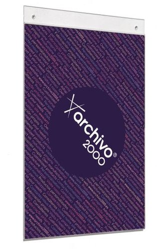 Expositor mural con agujeros pre-perforados para facilitar el montaje en la pared. Permite cambiar el documento sin necesidad de quitar el expositor de la pared.