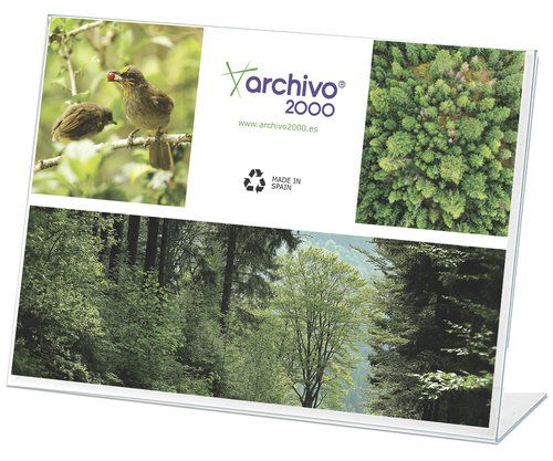 Expositor de sobremesa fabricado en poliestireno transparente cristal en forma de L, con amplia base (420 x 303 x 110 mm). El documento se desliza lateralmente.