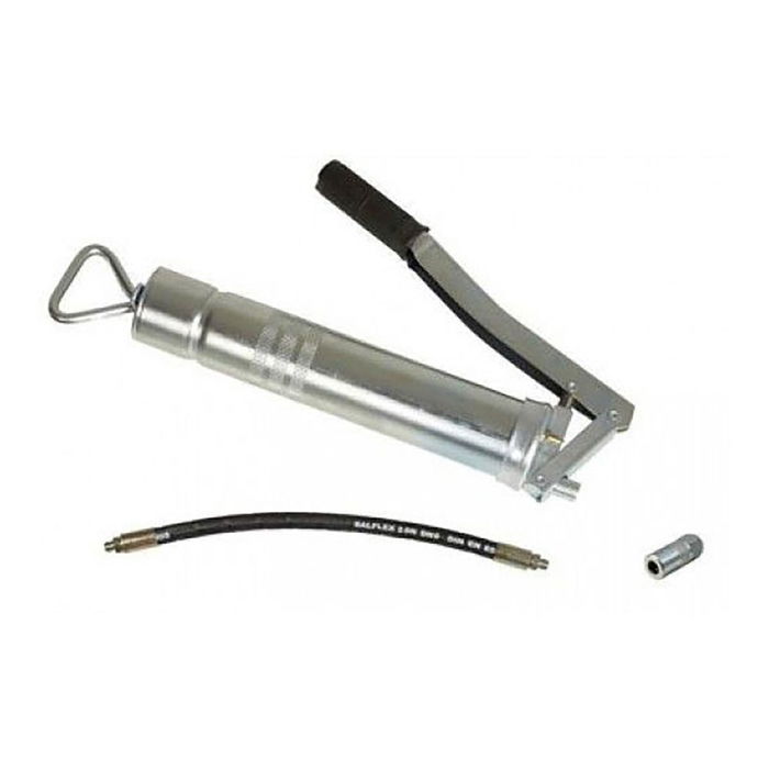 Bomba manual de engrase, de nuevo diseño para aplicación de grasa. depósito metálico de 500 cc. equipada con válvula purgadora de aire que permite el llenado mediante cartucho, granel o dispensador. sistema de fijación de varilla mediante palanca de bloqueo (trinquete), que permite recoger la varilla con el depósito lleno de grasa. indicada para trabajos de lubricación y mantenimiento profesional